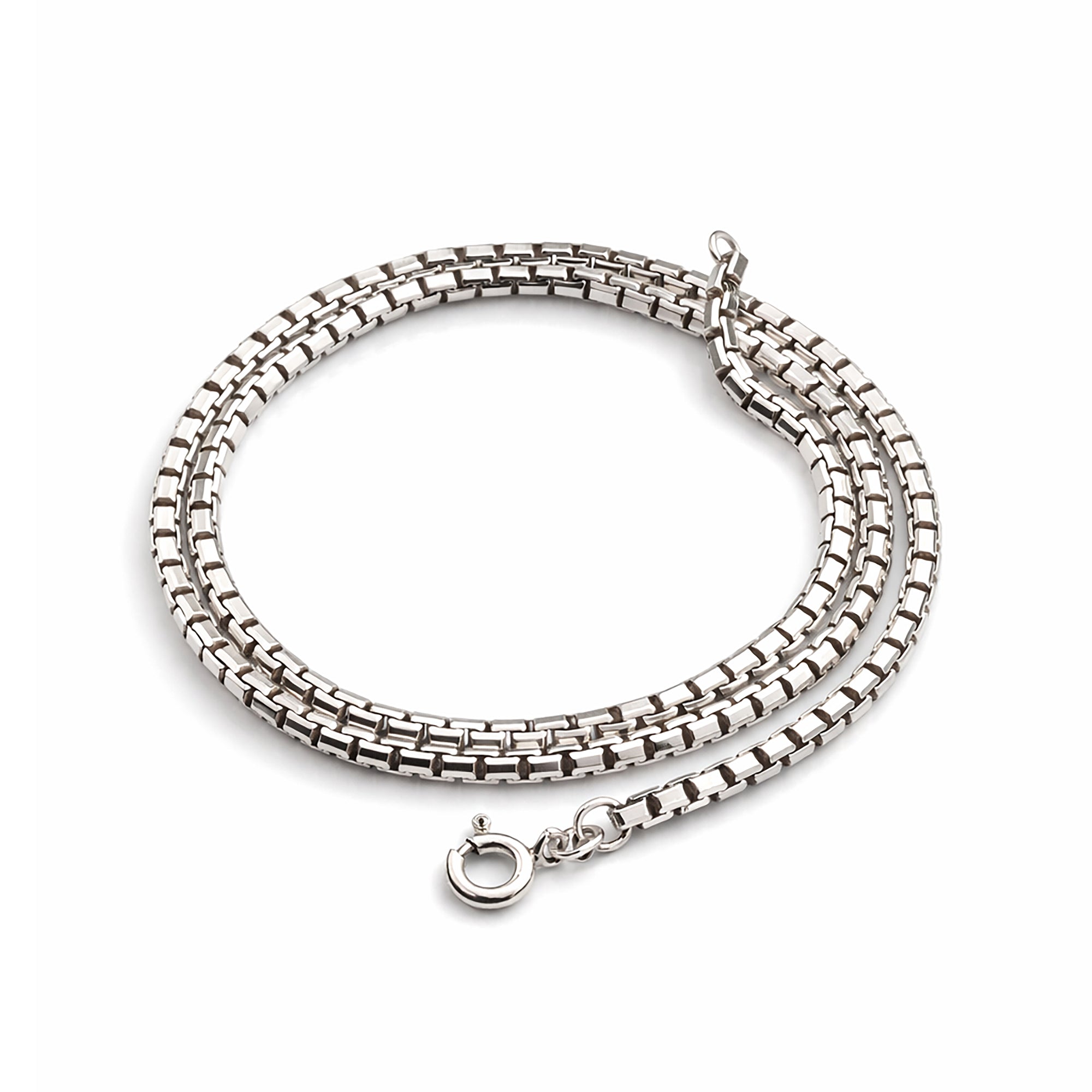 A substantial and beautifully crafted Venetian box chain, expertly refurbished to an excellent condition. Formed from interlocking square links, this classic chain offers a clean, structured look with a smooth, fluid feel when worn. Crafted in solid 925 sterling silver and weighing an impressive 19 grams, the chain provides a reassuring weight and premium presence around the neck. Fully cleaned and polished in our workshop, this pre-loved piece is ready to wear and suited for both standalone wear or paired with a pendant.