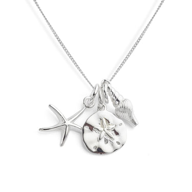 Our very popular Silver Sea Life Necklace provides a trio of sparkling ocean treasures consisting of a separate Conch, Starfish and Sand Dollar, all linked by a chain to present all three designs in one necklace. The necklace measures 14mm (W) x 19mm (H) x 5mm (D) and includes a Sterling Silver 18" chain with extender. The necklace is typically available from our showroom collection, shown here in available quantities, and arrives beautifully boxed and ready to wear.