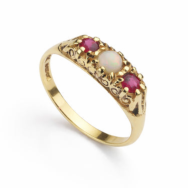 9ct Yellow Gold Opal & Ruby Trilogy Ring – Pre-Loved (1985)