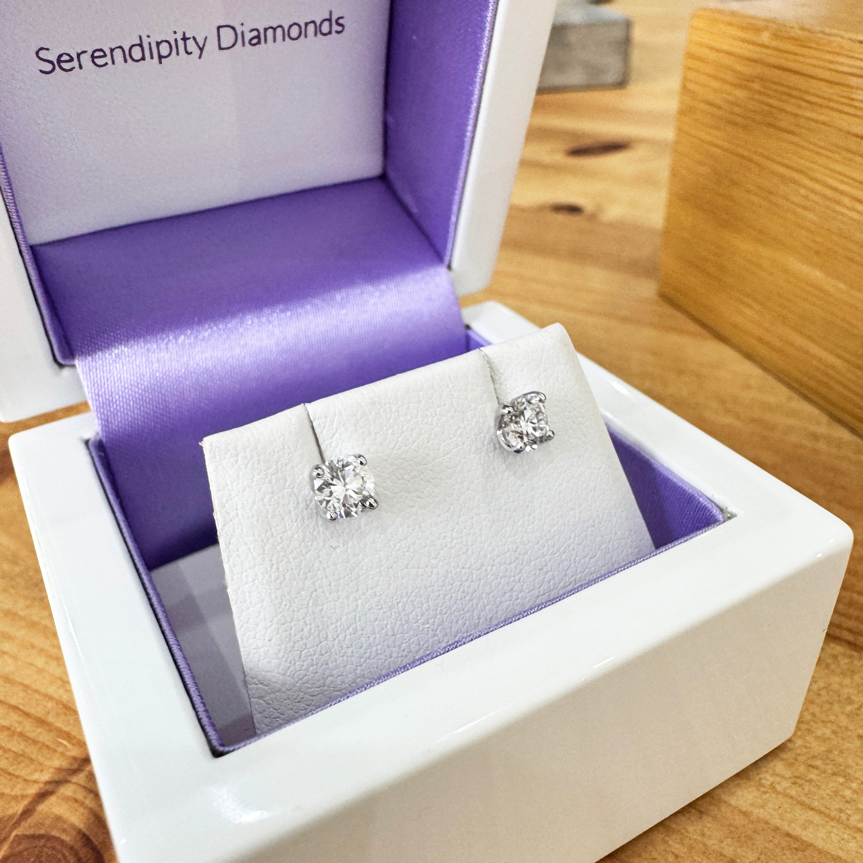 This elegant pair of diamond stud earrings forms part of the Serendipity Diamonds showroom collection, ready-made and ready to go. The popular "Paris" earring design features a pair of ethical lab-grown diamonds, 0.26cts each, weighing 0.52cts in total. The diamonds are set into 9ct White Gold and include full IGI certification, graded D colour and VS1 clarity for exceptional whiteness and purity.