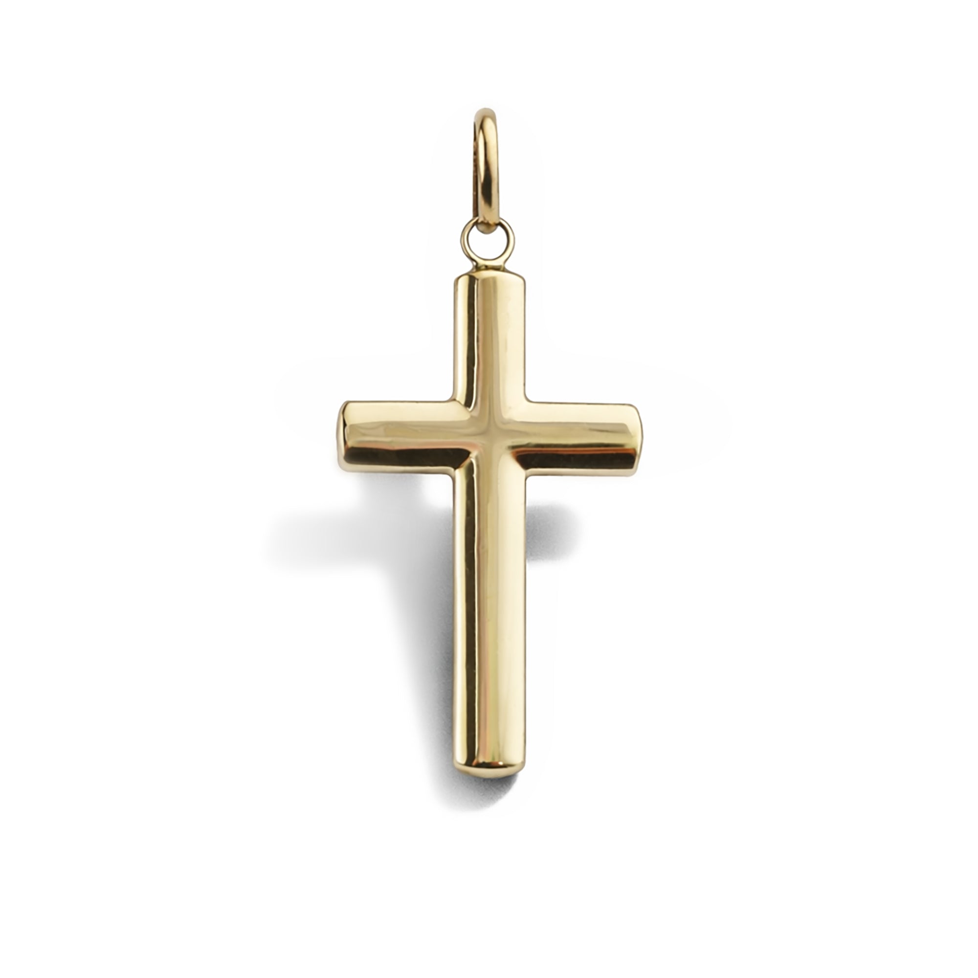 Formed in a hollow construction, the piece maintains a lightweight feel at just 1.5 grams — making it comfortable for everyday wear while retaining a substantial visual presence. The smooth, slightly contoured arms give the cross a modern, refined appearance without losing its traditional character.