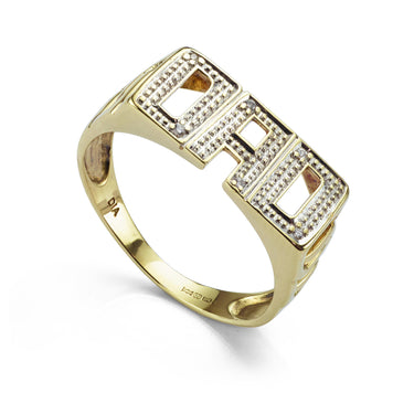 Celebrate fatherhood with this distinctive 9ct yellow gold “DAD” ring, crafted in a bold yet lightweight design. The ring features textured capital letters spelling DAD across the top of the band, each letter highlighted with six small diamonds set diagonally across the opposing corners, adding subtle sparkle against the polished gold finish. With its clean geometric styling and comfortable fit, this ring makes a meaningful piece of jewellery for everyday wear.