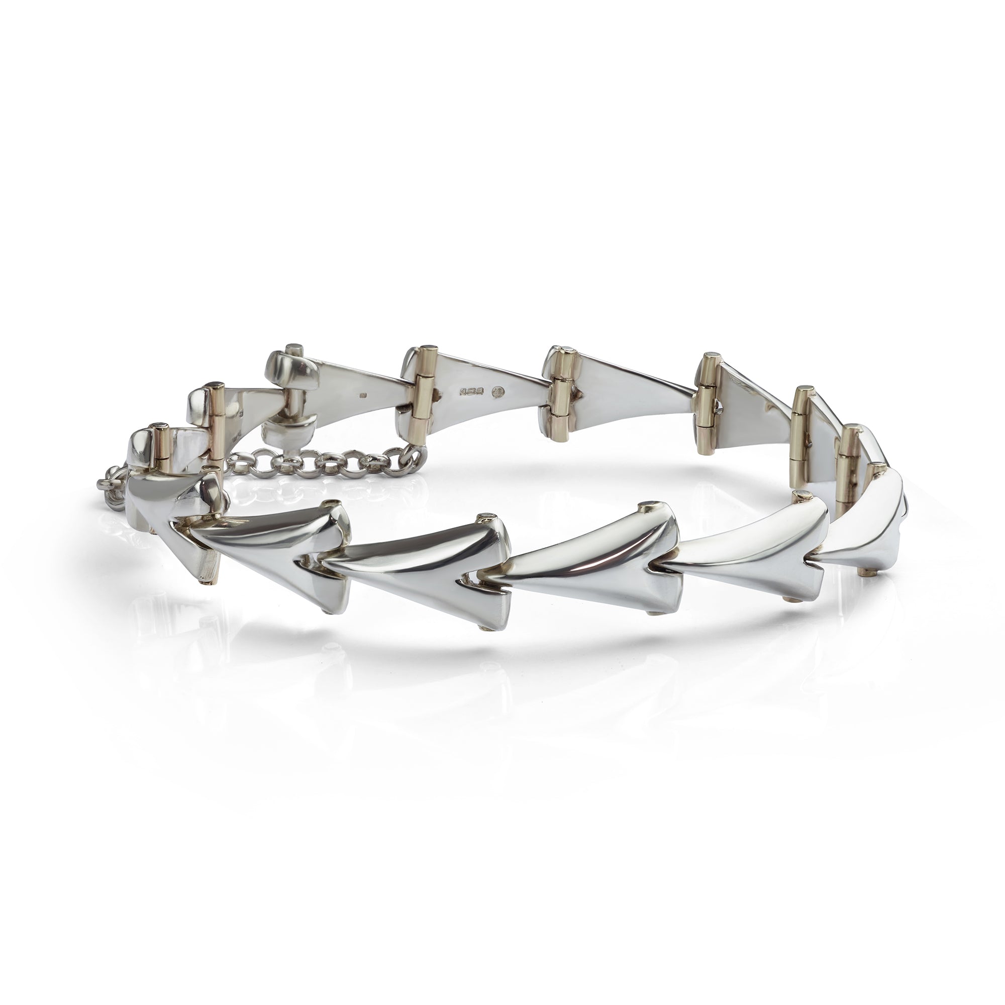 Another unique addition to our refurbished, pre-loved jewellery collection. The Sterling Silver Chevron bracelet has been uniquely handcrafted with a heavy, substantial and unusual design. Slender tapering sections individually hinge to give the bracelet design its flexibility. The bracelet measures 8 inches in length and has been cleaned and re-finished, presented in lovely condition.